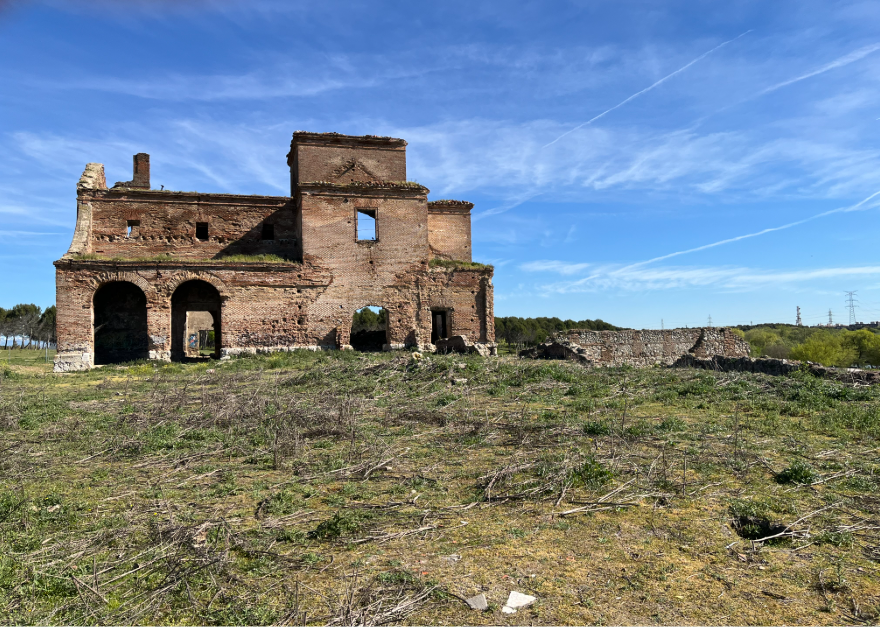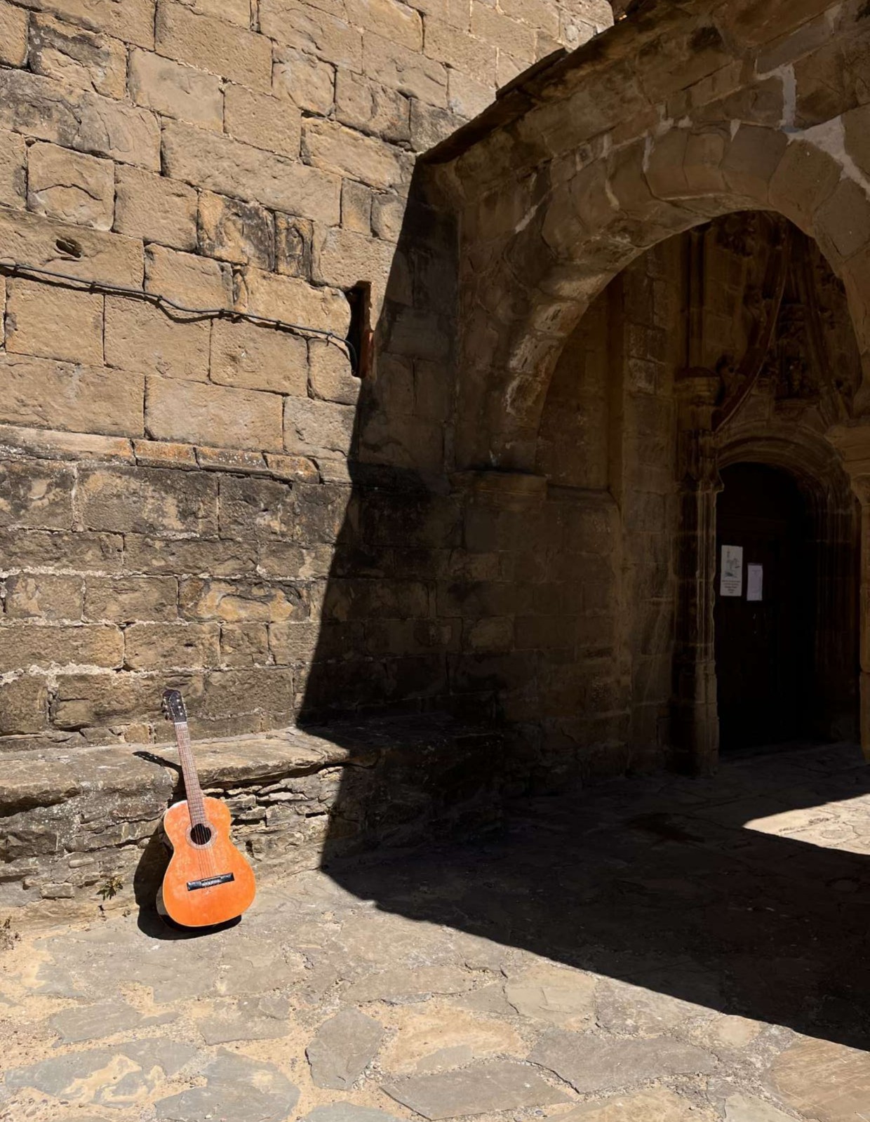 In this image, we can see the wall of an old church in a village, which represents the past and what other generations built. But the most important thing, the one that stands out the most, is the guitar placed on a stone bench. It is something current and close, and it makes us think that there is someone, even if we cannot see them.
